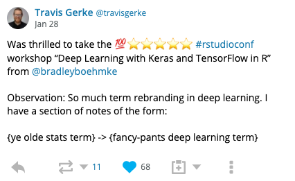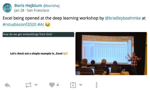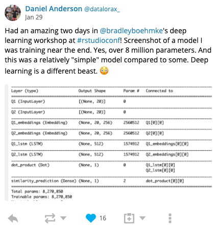 This year I had the opportunity to teach the Deep Learning with Keras and TensorFlow in R workshop . The workshop had max capacity attendence and was sold out within the first couple of months of opening up; showing a strong thirst for deep learning within the R community. With unbelievable support from TAs and RStudio, the workshop was a great success.