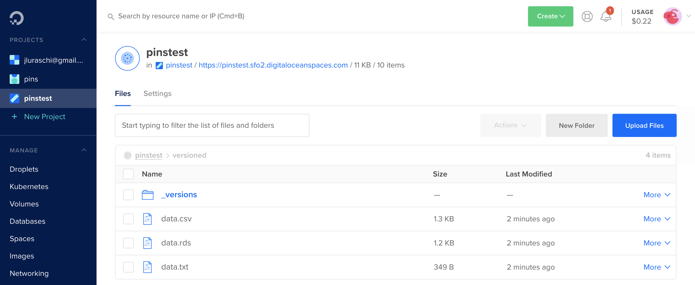 To try out the new DigitalOcean Spaces board , first you will have to register this board and enable versioning by setting versions to TRUE: