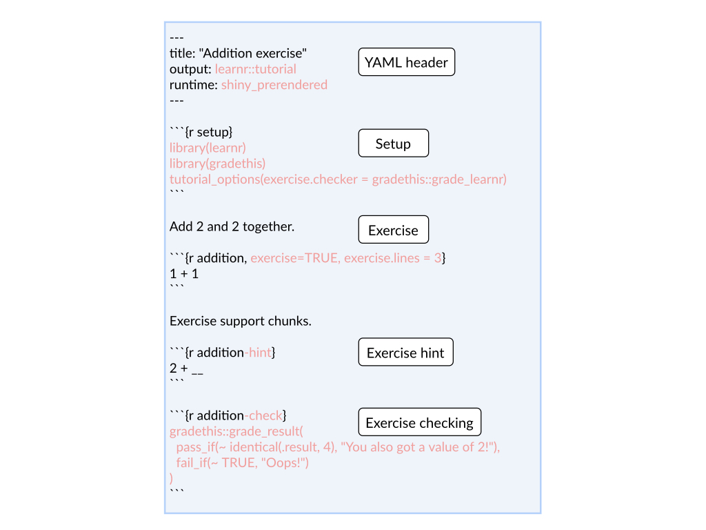 If you have used the base R Markdown, you will be familiar with components such as the YAML header, the setup code, and the knitr code chunks (the triple back-quoted elements). However, the red highlights shown here are the parts where learnr starts to diverge and extend R Markdown in the following ways: