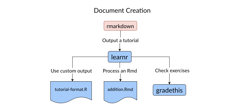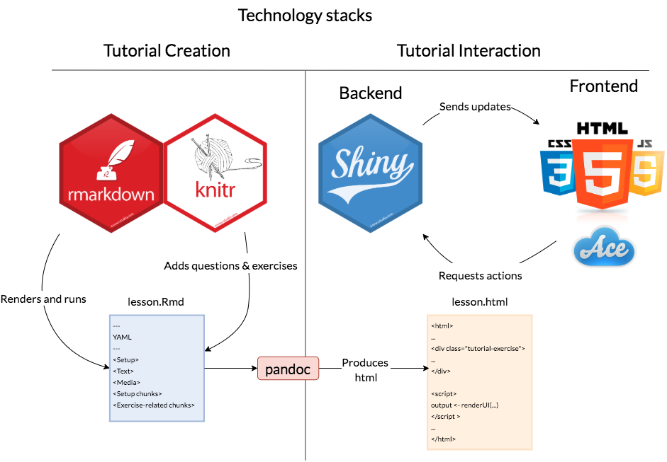 learnr combines many tech stacks, making it a difficult package to understand and traverse. However, I found a simple way to think about the package that might help you better grasp the technologies involved. learnr can broken down into two main parts: tutorial creation and tutorial interaction. These two parts allowed me to mentally organize how learnr is working under the hood as well as navigate associated R files involved in each part. This was also a pragmatic approach so I could make extensions to the code only where needed. Here is a high level view of these two parts and the technologies involved:
