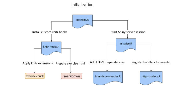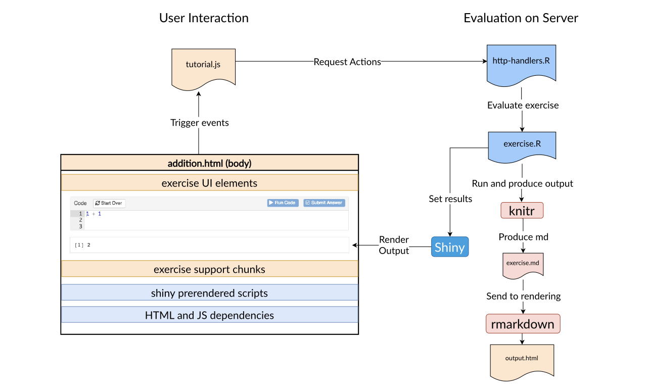 learnr has two main jobs to do before we move on to the interaction side: apply custom behavior for exercises and setup up the Shiny server. Roughly this is what that process looks like: