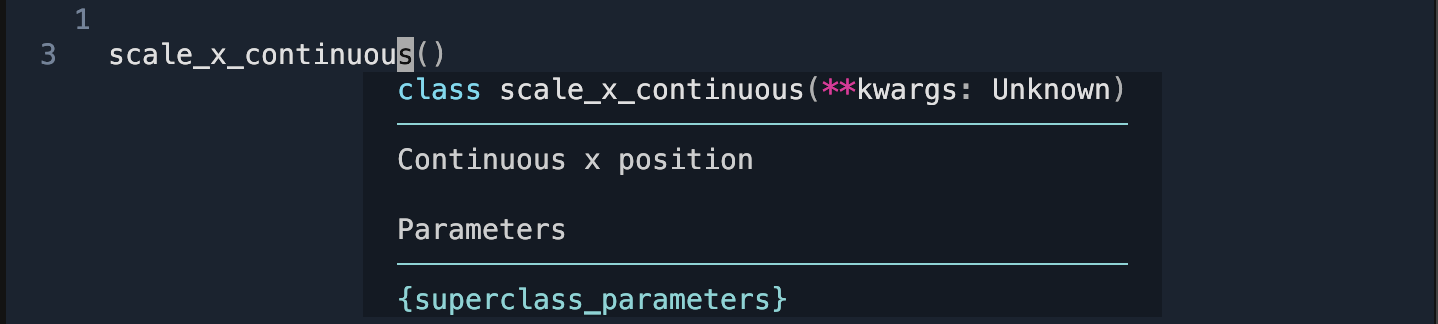 . This allows us to provide explicit signatures and enables the documentation system to automatically include inherited docstrings for parameters. For example, where an IDE previously displayed something like this:
