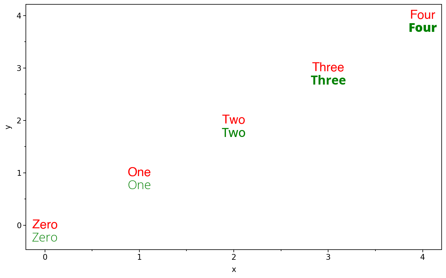 In theory, aesthetics represent any properties we can perceive; in practice, only those we can see and vary predictably can be useful aesthetics. Previously, text attributes like family, fontweight, fontstyle, and fontvariant were parameters but not aesthetics, meaning you could not map variables to them. Not anymore, these attributes of a text are now aesthetics!