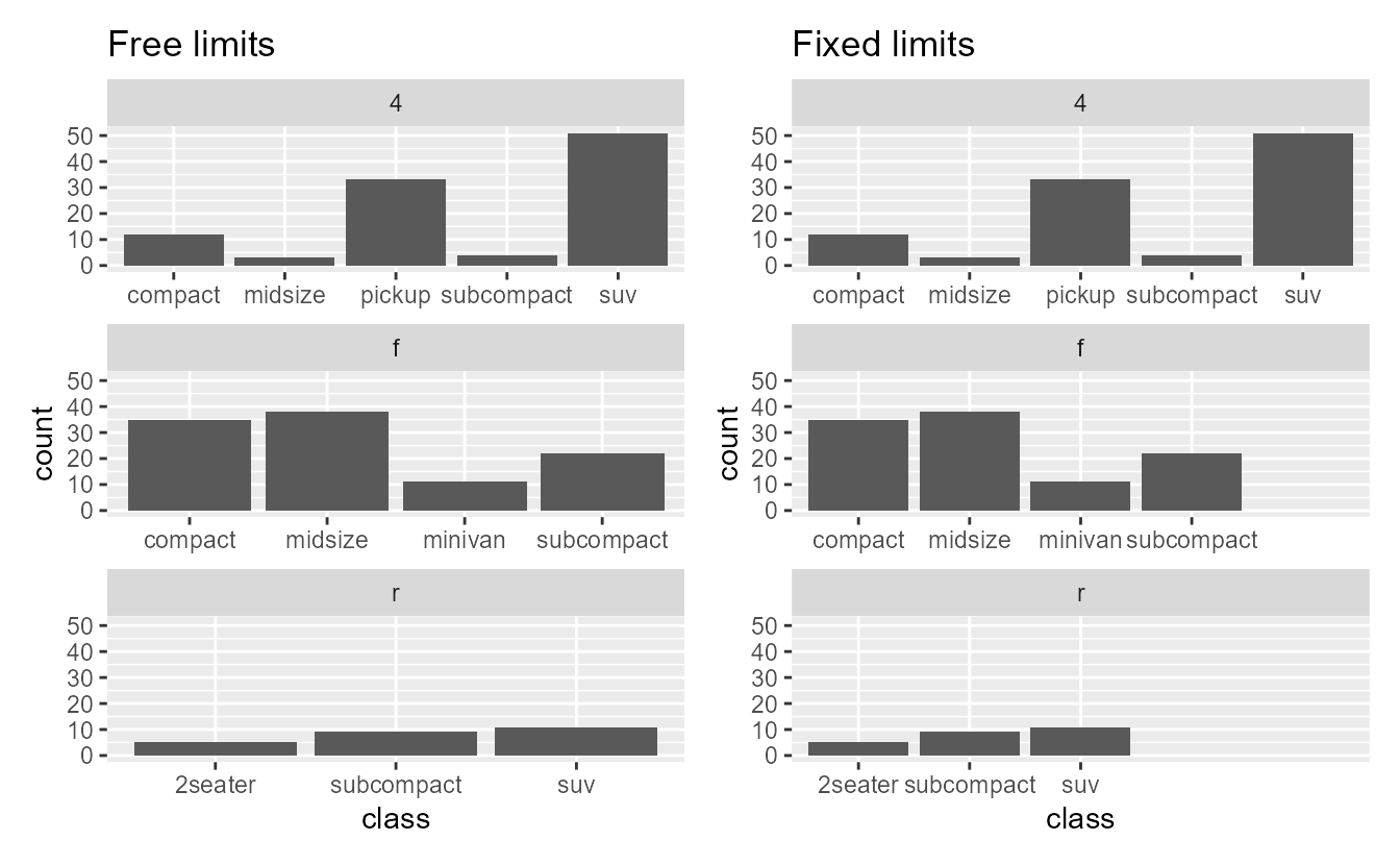 To coordinate (non-text) margins and spacings in a theme, we’ve introduced spacing and margins as new root elements in the theme. Other spacings and margins at the leaf elements inherit from (scale with) these root elements. To facilitate the different spacings in ggplot2, unit elements can now use rel() to modify the inherited value. For example the default axis.ticks.length is now rel(0.5), making the y-axis ticks 0.5 cm in the plot below. If we set the axis.ticks.length.x to rel(2), it will double the value coming from axis.ticks.length, not double the value of spacing.