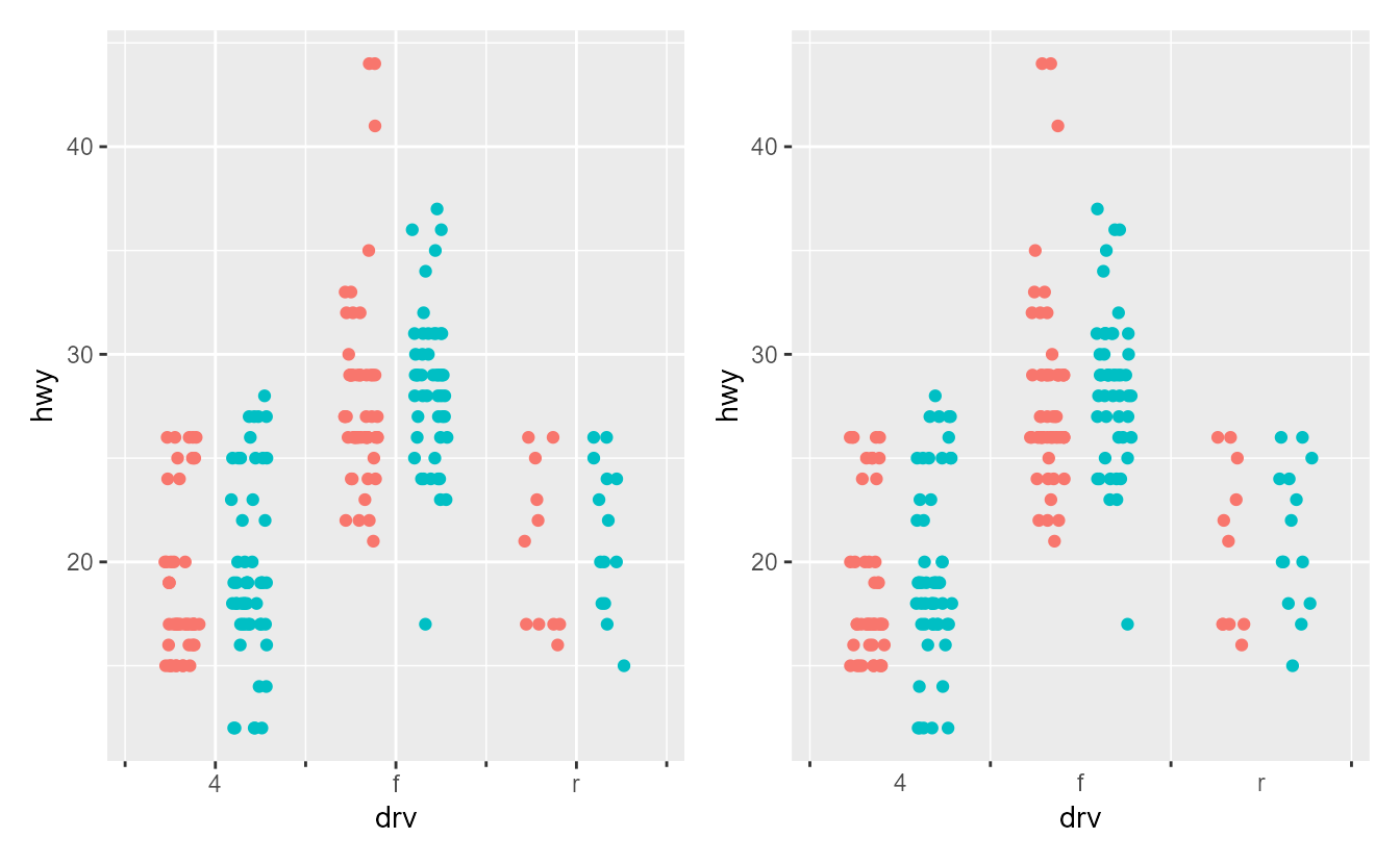 2. Aesthetics of the position adjustment are not be confused with position aesthetics. Position aesthetics like x and y are transformed by a scale, whereas aesthetics of the position adjustment like nudge_x and nudge_y are not (akin to width and height). ↩︎