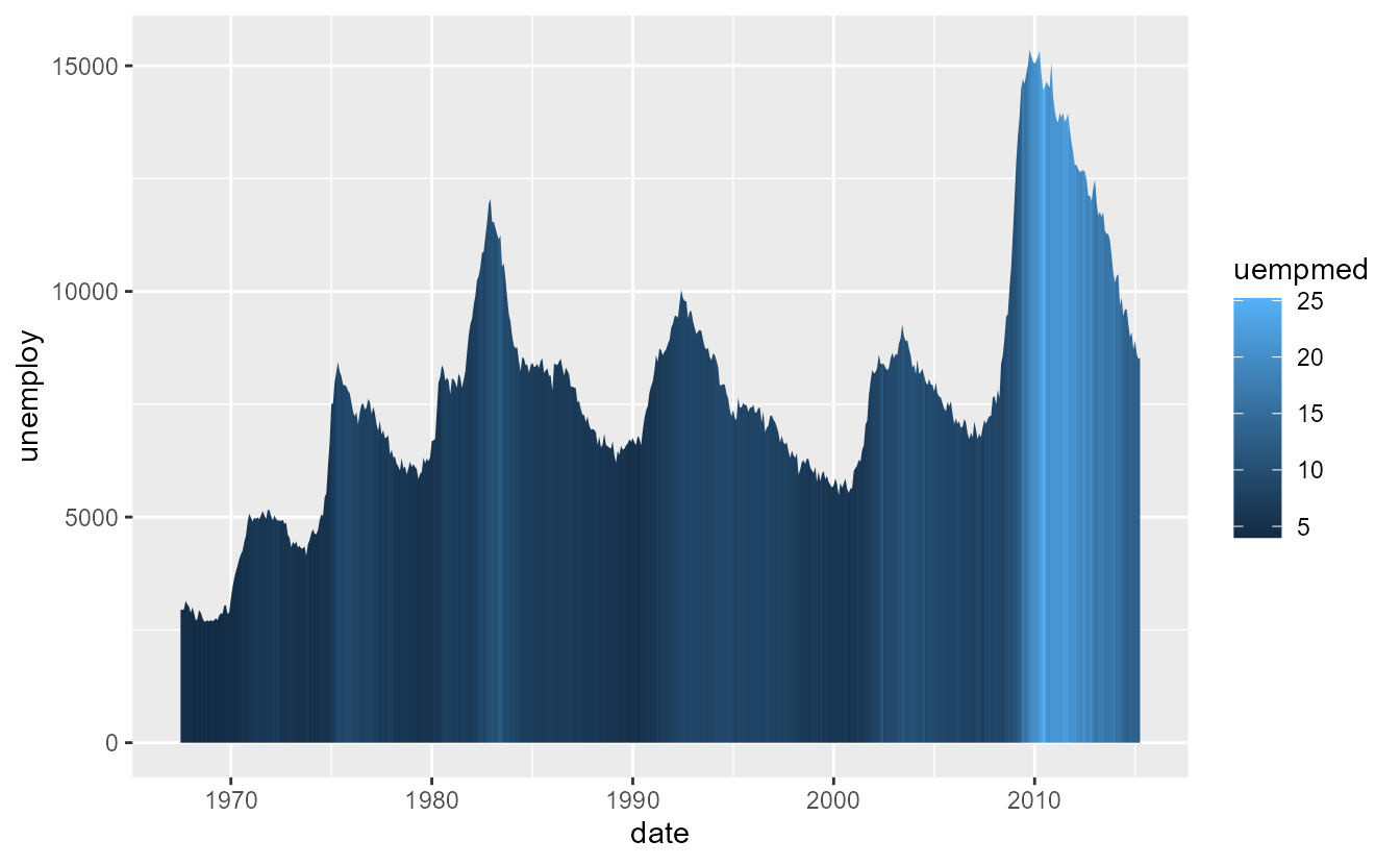 ggplot(eco, aes(year, y = mid, ymin = min, ymax = max)) +